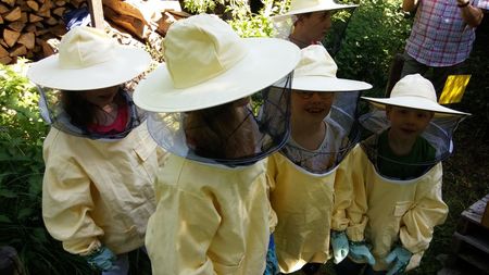 Anhand der Waben zeigte er, wie Honigbienen Nektar sammeln und ihn in ihren Waben zu Honig verarbeiten. Aus einer Wabe können ganze 4 Gläser Honig gewonnen werden. Auch die Entwicklung vom Ei über ein Larvenstadium wurde den Kindern anhand von Bildern deutlich gemacht, bevor sie ganz nah an die Bienenstöcke heran gehen durften. Mit Schutzanzügen ausgestattet, konnten sie hautnah beobachten, wie die Bienen an den Waben arbeiten. Zum Abschluss durften alle frischen Honig probieren.