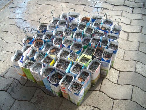 Die Merkenbacher Vogelschützer rüsten sich für den Winter. Für die umweltschonende Herstellung verwenden die Merkenbacher leere Milchtüten als Gussform. Das Gemisch aus 25kg Sonnenblumenkernen, 25kg Rindertalg, 5kg Haferflocken und 2 Liter Sonnenblumenöl wird in Milchtüten gefüllt. Nach dem die Masse erkaltet ist, wird die Milchtüte aufgeschnitten und entfernt. Das Ergebnis ist eine feste energiereiche Futterstange fertig zum Aufhängen. An 10 Futterstellen werden in den Wintermonaten diese 54 Kalorienbomben verfüttert.